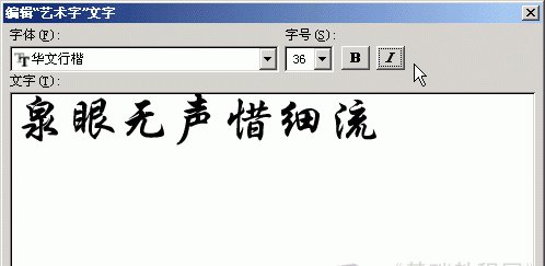 3)輸入“泉眼無聲惜細流”,然后把上邊的字體設為“華文行楷”,右邊的斜體按鈕點起來,然后點“確定”;