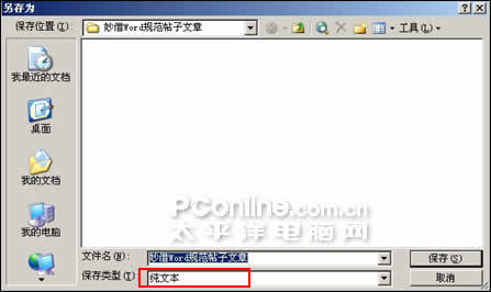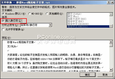 STEP 3:點擊菜單“文件→另存為”,在彈出的對話框里將“保存類型”列表框選擇為“純文本”格式。點擊“保存”按鈕后,在彈出“文件轉換”窗口,這里選中“插入換行符”復選框完成操作(如圖2)。