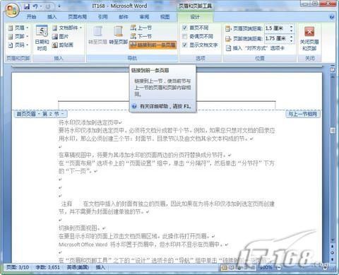然后在文檔上面頁眉區域單擊右鍵,選擇“編輯頁眉”,則自動激活了“設計”選項卡。在“導航”組中,我們可以單擊“上一節”或者“下一節”在各個節段之間跳躍。在需要分開定義頁眉的兩節之間,單擊“導航組”中的“鏈接到前一條頁眉”,使其不再選中。(圖2)