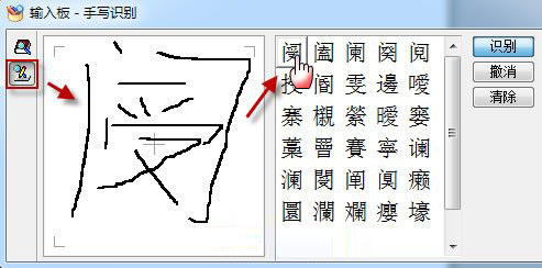 從輸入板左側,單擊第二個按鈕“手寫識別”。利用鼠標在輸入板中輸入生僻字,此時右邊會出現對應的候選字,將鼠標懸放到上面還能顯示讀音。找到自己需要的文字,單擊插入到Word文檔當中。