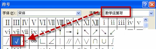 第四步,單擊“更改”之后,會彈出“符號”對話框,選中“子集”的“數學運算符”下面的“√”,確定。