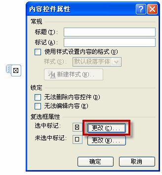 單擊“復選框屬性”的“選中標記”右邊的“更改”按鈕,對符號進行更改,比如我們需要的是勾而不是叉。