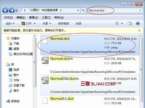 方法一:雙擊打開“計算機”在右上方的搜索框中輸入“Normal.dot”,此時Win7系統會自動搜尋名稱包含“Normal.dot”這個名稱的文件,搜索的結果可能有很多相似的文件,但你只需要找到“C:UsersAdministratorAppDataRoamingMicrosoft Templates”這個路徑下面的“Normal.dot”這個文件,然后將其刪除即可。
