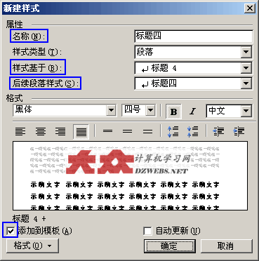 上圖中,有四個地方是需要你設置的,分別是名稱、樣式基于(這里就選擇標題4)、后續段落樣式和添加到模板。