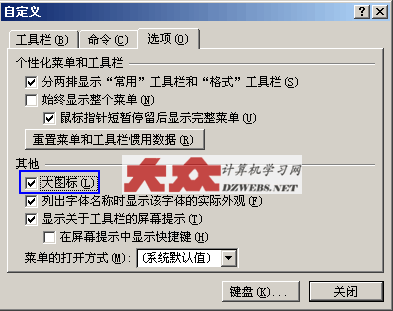 上圖中,切換到“選項”選項卡,在里面找到如上圖藍線圈住的那部分,把“大圖標”前面的√勾去掉,最后點擊“關閉”按鈕,即可解決圖標太大的問題了。