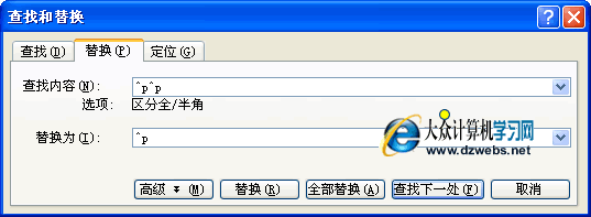 切換到“替換”選項卡。然后,在查找內容那里輸入 ^p^p ,在替換為那里輸入 ^p ,最后,點擊“全部替換”按鈕。