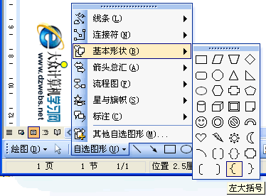 選擇“基本形狀”,就會看到大括號,選擇以后,按下鼠標左鍵不要松開,然后使用鼠標拖動,在WORD文檔中畫出如下圖的大括號。