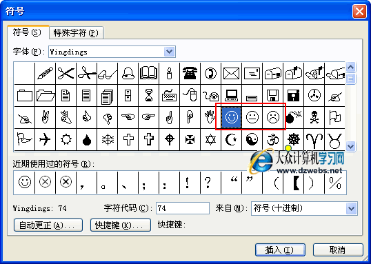 上圖中,首先在字體那里,選擇“Wingdings”,然后,我們就可以在列表框中找到笑臉的符號(hào)了,紅線圈住的那幾個(gè)。