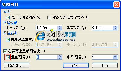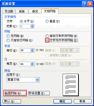 上圖中,首先選擇“文檔網格”,之后在選擇“文字對齊字符網格”;最后,再點擊“繪圖網格”按鈕進行下一步的設置。彈出如下圖對話框。
