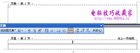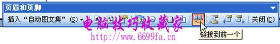 4、單擊“頁眉和頁腳”工具欄上的“鏈接到前一個”按鈕,關閉頁眉之間的鏈接,如圖: