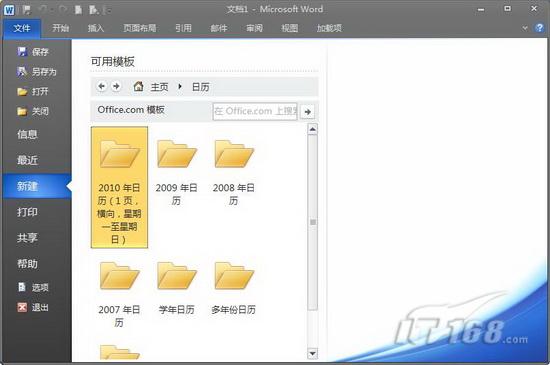 第一步:運行Word 2010,單擊“文件”按鈕,在彈出的下拉菜單中選擇“新建”,打開“可用模板”窗口,在“Office.com模板”列表中找到并單擊“日歷”(如圖1),打開“日歷”模板。