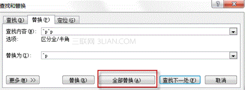 豆豆希望段落之間留下一行空行,刪除其它多余的。因此,可以在查找欄輸入^p^p,替換欄輸入^p,將兩行空行變成一行。然后,按全部替換按鈕