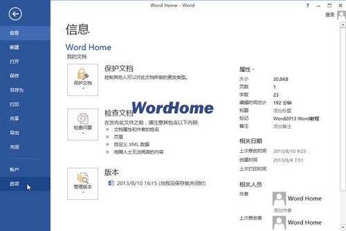 第1步,打開Word2013文檔窗口,依次單擊“文件”→“選項(xiàng)”按鈕,如圖2所示。