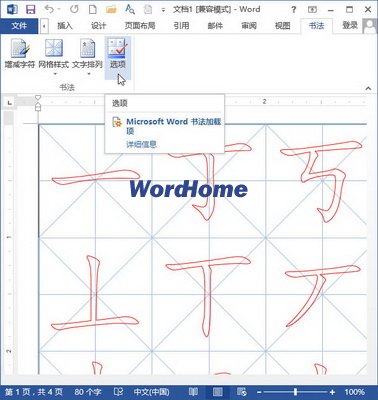第1步,在書法字帖編輯狀態下,單擊“書法”功能區的“選項”按鈕。