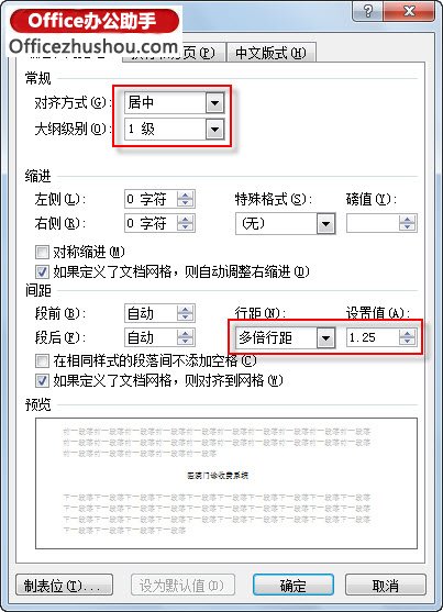 5、在隨即打開的“段落”對話框中,在“縮進和間距”選項卡的“常規(guī)”區(qū)域中將“對齊方式”和“大綱級別”分別設置為“居中”和“1級”,在“間距”區(qū)域,將“行距”及“設置值”分別設置為“多倍行距”和“1.25”。設置完成后,單擊【確定】按鈕,關閉“段落”對話框。