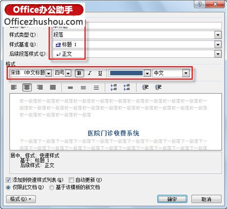 3、在隨即打開的“根據格式設置創(chuàng)建新樣式”對話框中,根據學校規(guī)定的樣式進行設置,如,在“名稱”文本框中輸入標題名稱,將“樣式類型”、“樣式基準”和“后續(xù)段落樣式”分別設置為“段落”、“標題1”以及“正文”等,并設置字體、字號及顏色等。