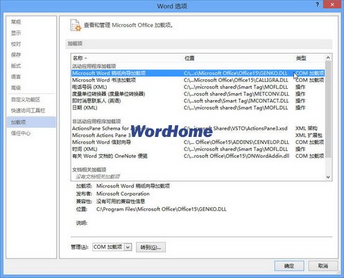 在“COM加載項”對話框中選中的Office加載項將在“Word選項”對話框的“加載項”列表中顯示,即啟用該加載項。取消選中的Office加載項將不在“加載項”列表中顯示,即禁用該加載項。