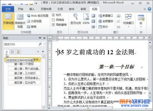2、在打開的導(dǎo)航窗格中,單擊“瀏覽您的文檔中的標(biāo)題”按鈕可以查看文檔結(jié)構(gòu)圖,從而通覽Word2010文檔的標(biāo)題結(jié)構(gòu),如圖2所示。