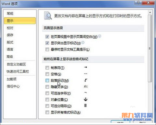 第2步,在打開的“Word選項”對話框中切換到“顯示”選項卡,在“始終在屏幕上顯示這些格式標(biāo)記”區(qū)域取消“段落標(biāo)記”復(fù)選框,并單擊“確定”按鈕,如圖所示。