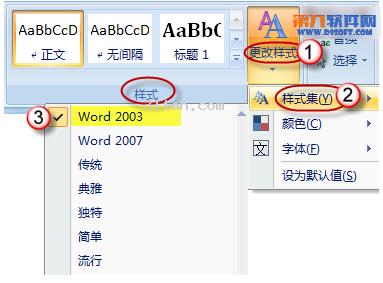 2、單擊“樣式”組中的“更改樣式”,指向“樣式集”,然后單擊要使用的樣式集。