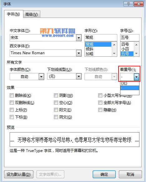 2、彈出字體對話框,單擊著重號旁的下拉箭頭,選擇那個點。