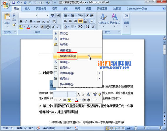 ③右擊“成”字,在右鍵菜單中選擇切換域代碼。