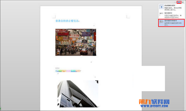 1、用Word2013打開一篇文檔,單擊標(biāo)題欄右側(cè)的“功能區(qū)顯示選項(xiàng)”,選擇“自動隱藏功能區(qū)”選項(xiàng)。