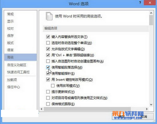 第2步,打開“Word選項”對話框,切換到“高級”選項卡。在“編輯選項”區(qū)域選中或取消“智能段落選擇”復(fù)選框,并單擊“確定”按鈕,如圖2所示。