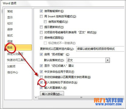 2、在“選項(xiàng)”窗口,單擊“高級(jí)”,然后從右側(cè)細(xì)節(jié)窗口找到“輸入法控制處于活動(dòng)狀態(tài)”,將其勾選。