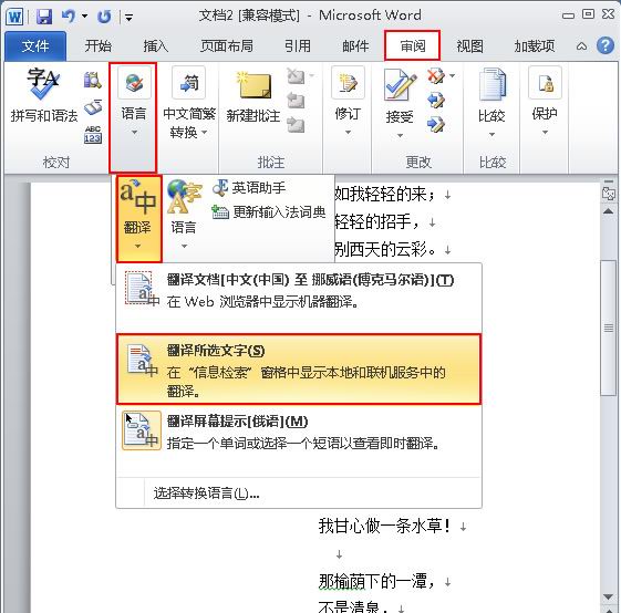 2、在功能區(qū)點擊“審閱”選項卡,選擇“語言”區(qū)域的“翻譯”選項組,單擊“翻譯所選文字”;
