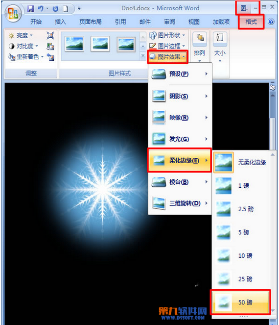 1.鼠標(biāo)右鍵單擊選中要更改的圖片對象,切換到【圖片工具】—【格式】選項(xiàng)卡,在【圖片樣式】功能面板中,單擊【圖片效果】,在彈出的下拉列表中,選擇【柔化邊緣】——【50磅】。黑夜里的一朵小雪花,是不是很漂亮。