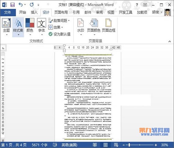 1、啟動Word2013,打開一份文檔,單擊菜單欄--設計--頁面邊框,這里值得注意的是Word2013頁面邊框設置選項是在設計選項卡中,其他版本則是在頁面布局選項卡中。