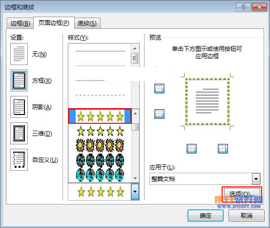 3、在藝術型選項中,下拉箭頭,選擇五角星圖案,然后點擊選項按鈕。