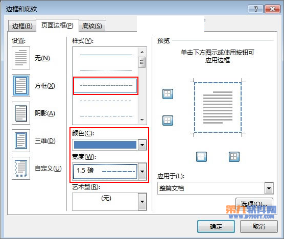 2、在邊框和底紋界面,線型選擇第三種樣式,顏色自己定,寬度為1.5磅。