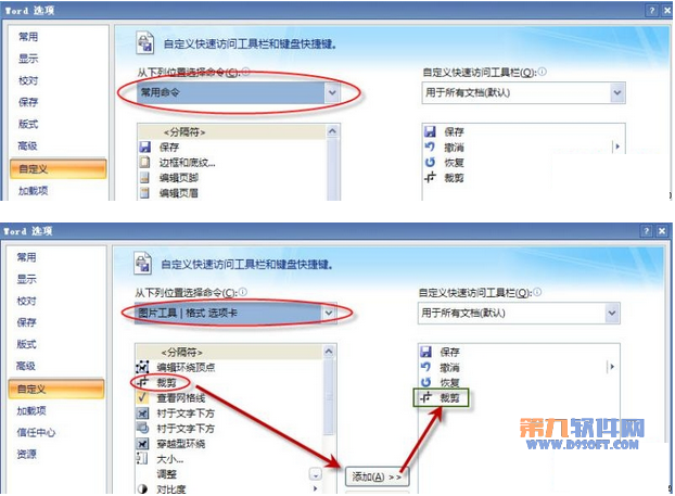 步驟2.步驟1圖中藍(lán)色箭頭所指處,下拉菜單選擇【圖片工具|格式選項(xiàng)卡】,在下方選擇【裁剪】按鈕并添加至右方快速訪問(wèn)工具欄