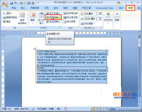 ②轉換為表格之后,單擊布局選項卡,在左側插入。