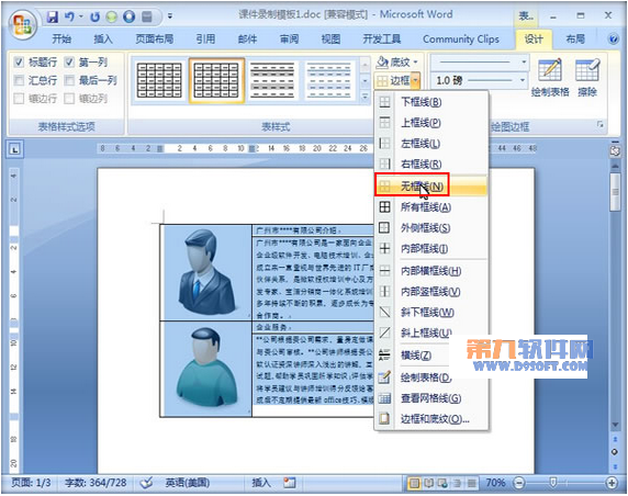 ⑦Ctrl+A鍵,全選,點擊設計選項卡中的邊框按鈕,選擇無框線。