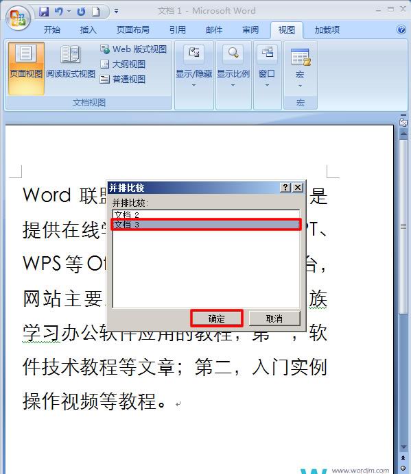 2.在彈出的對話框中,選擇要并排查看的窗口【文檔3】,單擊【確定】。