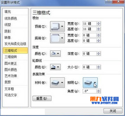 打開“設置形狀格式”對話框,在“三維格式”選項卡中,用戶可以對棱臺頂端和底端的高度和寬度進行設置,也可以設置棱臺深度和輪廓線的顏色。另外對棱臺的表面效果進行材料和照明方面的設置,能夠明顯改變藝術字的棱臺效果。完成設置后單擊“關閉”按鈕即可。