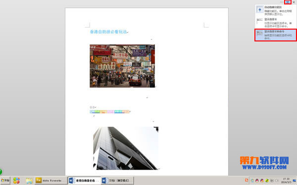 如果我們想退出全屏瀏覽,可以單擊右上角的“功能區(qū)顯示選項”,選擇“顯示選項卡和命令”選項。
