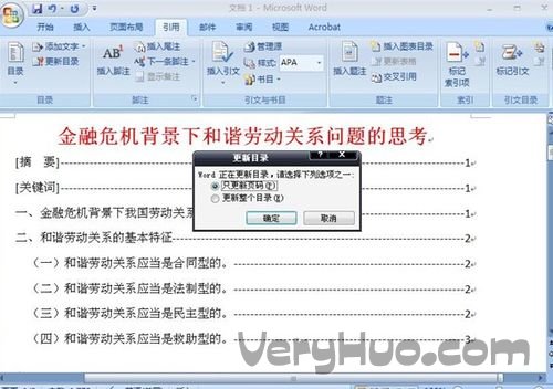當你重新修改文章內容后,你需要更新一下目錄,方法是:[引用]--[目錄]--[更新目錄],在彈出的