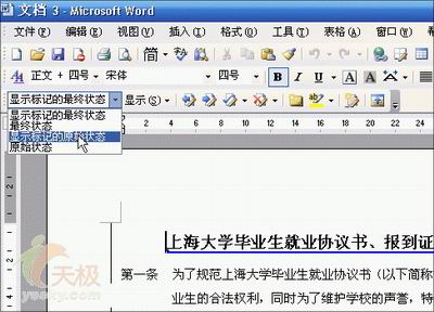 其實,這只是Word校對的默認(rèn)顯示方式問題罷了,對此我們可以通過修改其標(biāo)識顯示方式來解決。如下圖所示,Word現(xiàn)在默認(rèn)的是使用“顯示標(biāo)記的最終狀態(tài)”,我們只要把它改成“顯示標(biāo)記的原始狀態(tài)”就可以了。