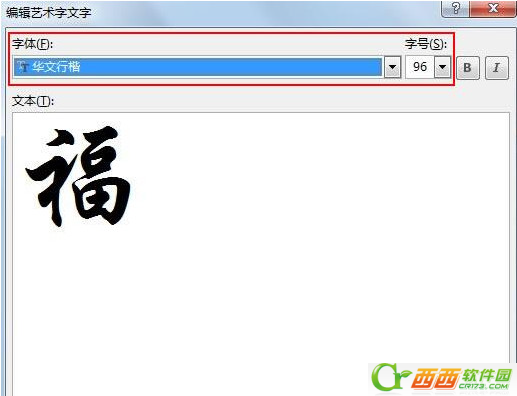 4.彈出編輯藝術字文字對話框,在文本中輸入“福”字,字體為華文行楷,單擊確定。