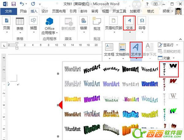3.下面準備插入藝術字,點擊菜單欄--插入--文字--藝術字,選擇紅色方框標記的樣式,如圖所示。