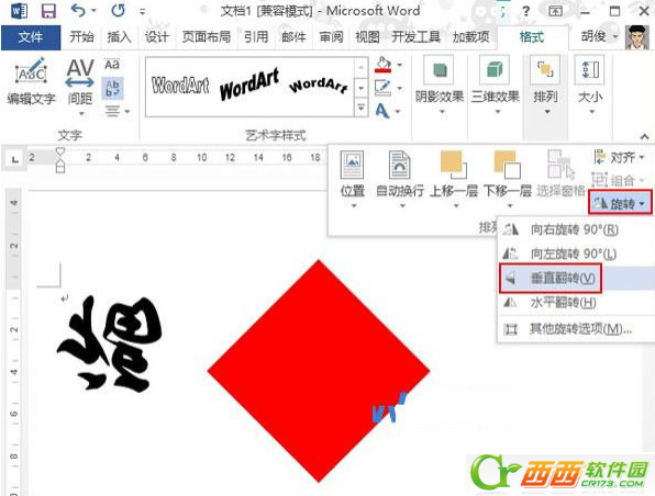 6.在格式--排列--旋轉選項中,將文字垂直翻轉,形成倒立的樣子。