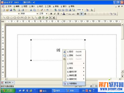 3、在框中輸入文字,這里輸入一個“燒”,單擊鼠標右鍵,在彈出的對話框中選擇“對象屬性”。