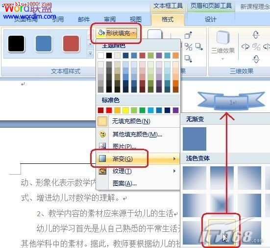 ③單擊“形狀填充”→漸變,直接去選擇一個(gè)漸變樣式。也可以單擊“形狀填充”→圖片,直接選擇一個(gè)圖片作為頁碼樣式的背景。當(dāng)然了你也可以單擊“形狀填充”→紋理,選擇一種紋理作為文本框的背景。