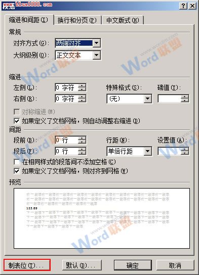 2、這時候會彈出一個【段落】對話框。在段落對話框的最下面一行我們選擇【制表位】選項。