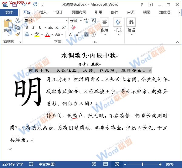 1、Word2013打開我們需要調整的文檔。Ctrl + A 選中全部,如果我們需要全部調整的話,這是個快捷鍵。如果我們想一段一段的顯示的話就選中自己需要的段落,這樣也更突出。在這里blue1000演示的時候就不那么費勁了,我們只拿一句來做例子,讓大家知道其中的操作模式就行了。例如下圖,我們選中一句,然后【開始】——【字體(后面的小標符,詳見下圖)】注意下圖中樓主用紅色框標出來的選項。