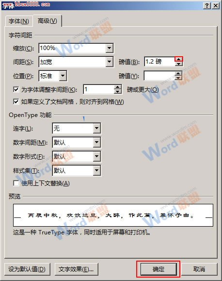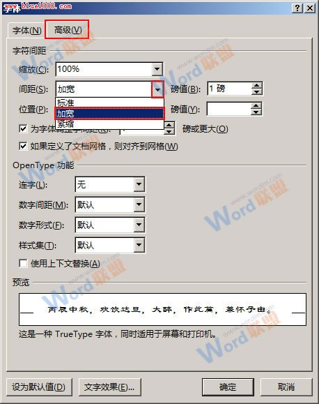 2、一看到這是彈出來的那個【字體】的對話框的時候好多童鞋都明白了該怎么做了,最關鍵的其實是上一部不好找。我們對字體沒什么要求,所以咯我們需要調整的是【高級】選項。對話框里很明顯有【間距】和【磅值】我們可以通過調整【間距】里的選項來調整字間距是【加寬】還是【緊縮】抑或【標準】,如果加寬的寬度不夠我們理想的話,還可以通過【磅值】來調整。這里就用加寬來示范下吧??聪聢D